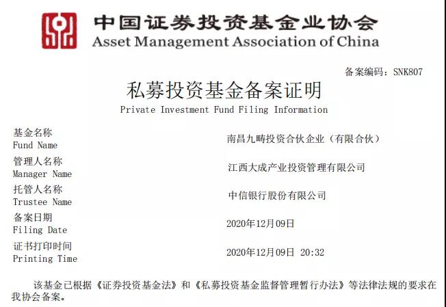 近日,由江西省投资集团有限公司(以下简称集团公司)发起的首支母基金——南昌九畴投资合伙企业(有限合伙)(以下简称“母基金”)在中基协备案成功。